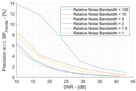 Figure 8. Ionoacoustic relative precision versus SNR and Relative Noise Bandwidth.