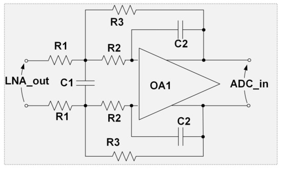 The −3 dB frequency (13 kHz), Q factor (0.707, corresponding to a Butterworth filter) and gain (G = 1) allow one to dimension the passive components as in (6)–(9) [15]. The main filter parameters and component values are reported in Table 2.