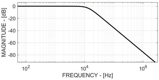 Equation (5) allows one to dimension the noise sources (operational amplifier and resistors) so that they are negligible with respect to the noise of the sensor and of the LNA. Figure 10 shows the simulated low-pass filter frequency response.