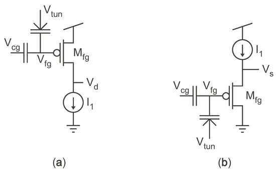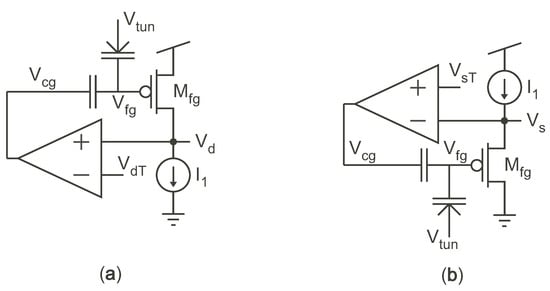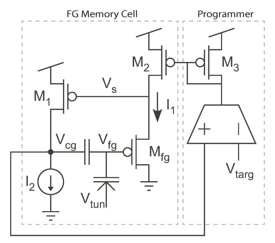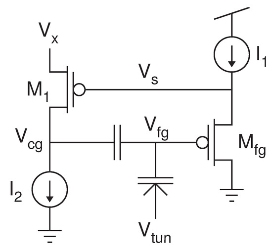 Figure 2 shows the two primary types of FG cells for self-converging, continuous programming that use the inherent feedback in MOSFETs undergoing hot-electron injection to converge to a final value. For both the circuits, as electrons are injected onto the FG, the FG voltage,