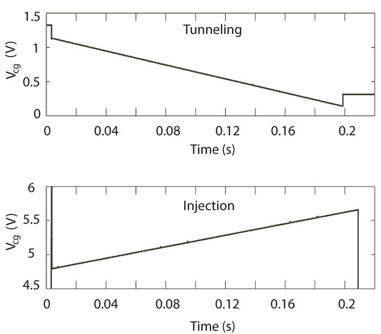 ramps linearly up during injection, or down during tunneling, to compensate for the change in charge on the FG—see