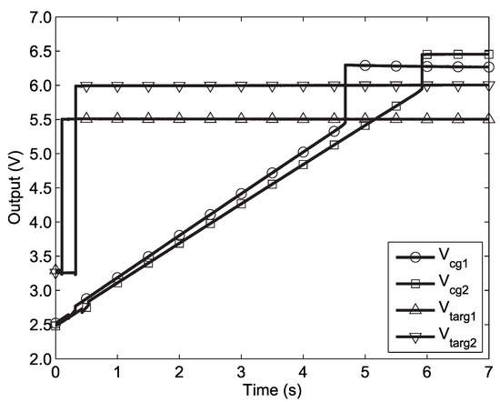 Figure 18 shows two FG memory cells on this chip being programmed in parallel using our programmer. Note that while 8 memory cells are programmed in parallel on this chip, the voltage outputs of only two cells were observable at any time—one was observable via selection by the the SPI, and another was hard-wired to output pins for debugging purposes. In this Figure at 100 ms, the first S/H is clocked, sampling the DAC output to set