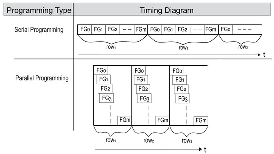 Figure 19 demonstrates the programming time for serial and parallel programming. As the Figure illustrates, to program an array of FGs serially, one FG is programmed at a time, which makes the programming process linearly proportional to the overall size of the array. Using the serial method for programming results in overall programming time of: