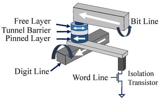 MRAM bitcell (Figure 2) contains one MTJ and one NMOS access transistor. The MTJ lies between a pair of metal-lines named digit-line and bit-line to facilitate write operation. The metal-lines are parallel to the cell plane and placed orthogonal to each other. An induced magnetic field is created with appropriate polarity by passing current through the lines during write operation. The field exerts a torque on the free layer magnetic orientation, causing it to flip. During read operation, the access transistor is turned ON, and a fixed voltage is applied across the cell to sense the equivalent resistance.