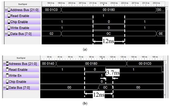 MRAM (a) write and (b) read waveforms. Note that with 12 ns of write enable (low) signal, data (0x0C) is written successfully (to address 0x00 0180).