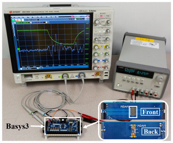 First, we interfaced the MRAM chip with logic analyzer and wrote all addresses at faster than 15 ns write time@ = 3.3 V, 25 °C. We found that the data is written successfully for all chips at 12 ns (Figure 5). Therefore, the write time should be less than 12 ns at nominal operating condition to bias the cells with 50% write probability. We read the data at 30 ns in order to avoid read failures. Next, we interfaced the MRAM chip with the FPGA. The writing is done at much higher frequency to achieve partial write and reading is done at 25 MHz (40 ns). The read/write traces are captured by Keysight DSOS-804A Oscilloscope [26] with sampling frequency of 20 GSa/s and Bandwidth of 8 GHz. The experimental setup is shown in Figure 6. Data is sent to a PC using UART (baud rate 9600 bps) for MATLAB analysis.