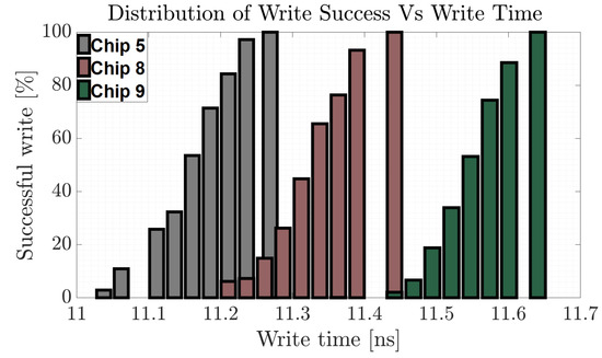 Cumulative Distribution Function (CDF) of write success of 3 chips (out of 10). These 3 chips exhibit maximum write time variation.