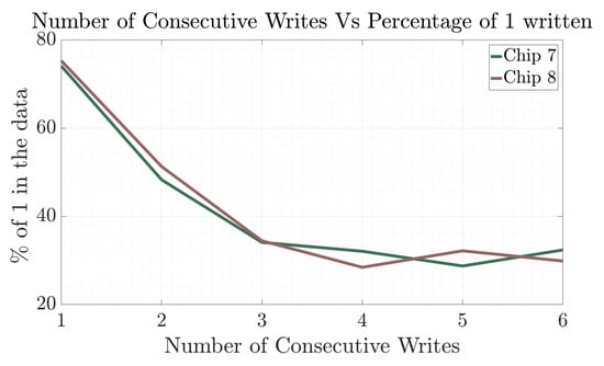 (c) Consecutive writes of 1 s with the same short write time reduces number of 1 s in the data (consequence of (b)). For example, if the addresses are flushed with all 0 s and then written with all 1 s with write time to flip 75% bits (which is ) and the writing is repeated with same time (without flushing in between), the number of 1 s in the data reduces to ≈49%, ≈34% and then remains fairly constant (Figure 8). This can be useful for TRNG (further explained in Section 4).