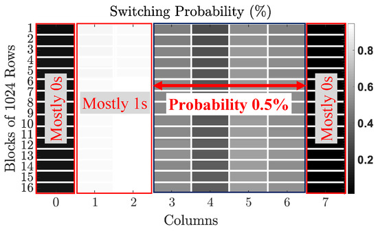 (d) Columns 0 and 7 are biased to data 0, columns 1 and 2 are biased to data 1 and column 3–6 mainly shows 50% switching probability (Figure 9) although we select the write time to flip 50% of the bits for the entire memory array. Therefore, columns 0, 1, 2 and 7 cannot be used for PUF and TRNG. If every cell needs to be biased at their own 50% switching probability, then write time for each cell in a row/column needs to be controlled individually which is practically impossible.