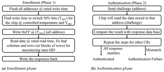 (a) Enrollment phase (Figure 10a): In this phase, unique signature from a chip is extracted using the method described below. First, the manufacturer prepares the memory in an initial state by writing all bits with 0 s (flushing of the MRAM). Next, the manufacturer try writing all 1 s with a write time to switch 50% bits to 1. Note that, is supply voltage () and temperature dependent. As the manufacturer has access to a controlled-environment, managing target and temperature will not be an issue. Finally, the entire address space is read to extract unique signatures. The steps are repeated for several chips to create a pool of data for statistical analysis and subsequent correctional measures. Then, all chip responses will be compared to separate the unresponsive columns/rows (that show no variation) for all chips and which gives highest uniqueness for different chips. Based on this observation, the unresponsive columns and rows need further processing (discussed in Section 3.3).