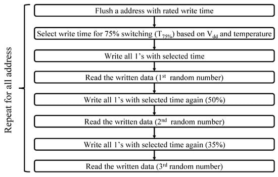 Figure 12 presents the algorithm to realize TRNG from the MRAM chip. First, the memory address is flushed, i.e., 0 s are written to all bits. Next, the write time is set to 75% switching probability and 1 s are written to the addresses. The 75% switching probability means the ratio of 1 s to 0 s will be 75%. The data written is considered as the first random number. Then, the same address is written again with all 1 s with the same write time. We notice that the ratio of 1 s to 0 s reduces to ≈50% (observation (b), Section 2) on the second write. This is the second random number. Similarly, when we write for the 3rd time the 1 s to 0 s ratio drops to ≈35% which gives out the 3rd random number. By repeating the same process for different write times and different addresses, we can generate more random numbers.