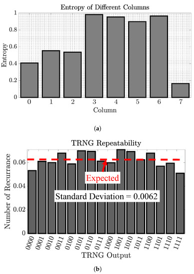 where p1 and p2 are probability of 1 s and 0 s respectively in a n-bit long data stream. For an ideal TRNG, the entropy is 1. We have calculated entropy of all chips column-wise and the average entropy is shown in Figure 14a. It is evident that, columns 0, 1, 2, and 7 show poor randomness (explained in previous section) and therefore needs to be masked. After masking, the proposed TRNG offers an entropy of 0.95.