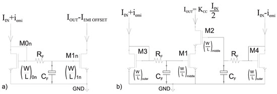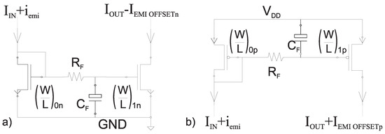 Figure 1 represents the conventional N and P-type current mirrors. The input current is nominally translated into the output current according to the ratio . The presence of an EMI current superimposed on the input current affects the output current . A low-pass filter () has been placed to highlight the EMI-induced (DC offset) current named and in Figure 1a,b respectively. Notice that along with the paper, the capitalization and lower cases used to name the currents refer to their DC and time-continuous signal values respectively.