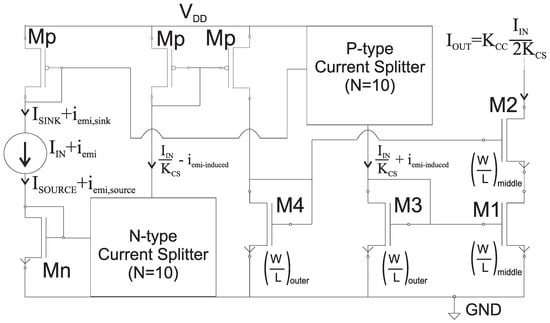 The input current is scaled down by a ratio factor through both P and N-type current-splitters. The presence of complementary current-splitters in the circuit in Figure 6 allows to rapidly scale the input current and benefit from the EMI-induced offset compensation based on an N-P offset compensation [40], which is performed through the current-correlator. The scaled currents coming from a P and N-type current-splitters flow to the respective current correlator that balances the opposite offset trend according to Equation (7). Assuming the aspect ratio of the current-correlator is equal to :