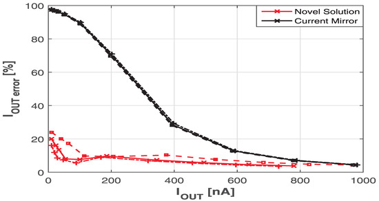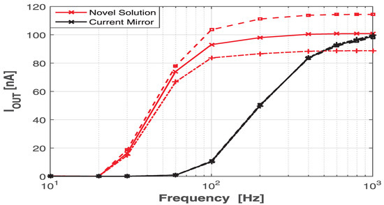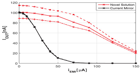 In Figure 7 the EMI-induced offset on the current nA versus the amplitude of the interference at 100 MHz is reported. A relevant gap between the two EMI-induced offsets on the output current can be highlighted. The newly proposed solution represented in Figure 6 shows an error on the output current below 5% for a CW RF interference current equal to μA. In the same condition, the conventional current mirror exhibits an error of 90% (from 100 to 10 nA).