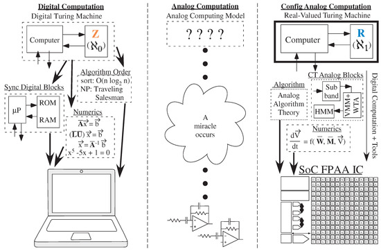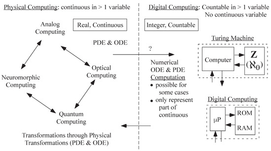The rapid progress in today’s ubiquitous programmable digital infrastructure relies as much on digital Turing machine theory [1] as it has on Moore’s law scaling [2,3,4] and VLSI [5] in providing a framework to use these hardware capabilities. A roadmap of future directions was in place as new technologies were available. Turing Machine theory (Figure 1) provides a core digital computation, computes over discrete, integer values, and was based upon bookkeeping businesses at the time [6]. The mathematical framework is central to abstracting digital computations, central to computer architectures and algorithms, as well as is central to numerical computation and analysis (Figure 1).