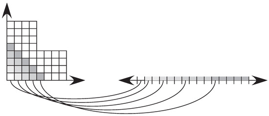 Real valued functions in multiple dimensions have the same complexity as a real-valued function in one dimension. The size of the set of all real numbers ((R) between 0 and 1 is infinitely larger than all integers (Z) between 0 and ∞. The size of Z between 0 and ∞ is represented as , and the size bf R between 0 and 1 is represented at . Two R dimensions can fit into a single R dimension. Working along the diagonals of a 2D R map, one can recount the 2D space into a single one-dimensionsal (1D) space (Figure 2) as the same order of infinity (). More available dimensions opens up additional implementation opportunities and resulting efficiencies, although these dimensions do not affect the system complexity.