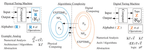 Algorithmic complexity between Synchronous Digital Computation and Physical computation is the comparison between R versus Z Turing capabilities (Figure 3). Algorithm complexity (Figure 3) considers whether a particular computing structure can compute certain algorithms in Polynomial (P) time, or scales by some other function, such as exponential time (EXPTIME). One can consider the class of polynomial-time physical (P) and digital (P) algorithms, the class of digital NP problems (NP) and similar class of NP problems for analog computation (NP), as well as the class of exponential-time analog (EXPTIME) and digital (EXPTIME) algorithms (Figure 3). One must consider a product of time and resources, although if one considers only polynomial resources, time complexity is sufficient. P completely overlaps with P as one can make digital gates from analog blocks (Figure 3).