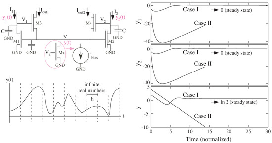 by scaling the input signals by the bias currents, , and scaling the voltages by U, , and defining , as the gate to surface potential coupling for the MOSFET transistor, & is the coupling of the drain voltage into the source-side surface potential (assume 0.01 for this example). I is the current source current set by V on the gate of M. Transistors M3 and M4, that have the corresponding output currents of I and I, have their drains at the upper power supply for this example, resulting in both transistors (M3, M4) operating in saturation with subthreshold currents. The capacitors, C, could be either parasitic or explicit capacitances; for clarity of this discussion, all capacitors are considered equal to C. The difference between and results in a stiff ODE, resulting in higher sampling for stable performance in Z-based computation, resulting in a significant computational issue (e.g., [16]), as the I and input currents I, I can be orders of magnitude different from each other.