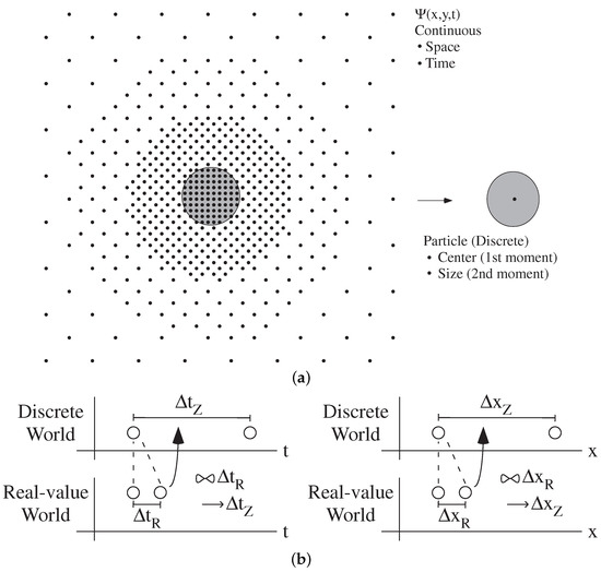 Particles are a useful abstraction to represent continuous-valued physical phenomena, and yet, the abstraction does not constrain the continuous-valued reality. Our abstraction of physical particles does not preclude the reality of continuous-values in the physical world (Figure 7a). A misconception is that electrons are finite, like marbles, and therefore, in the end, everything is discrete and countable, like a digital Turing machine. Quantum mechanics understands the dual particle and wave nature of reality, although the particle formulation tends to dominate academic thinking in this space [40]. Electron particles can be considered eigenfunctions of the resulting waveform [40]. Furthermore, even if particles were discrete, their position at a particular moment in space and time is a real quantity. Sometimes considering an uncertainty principle, , which is similar to time–frequency behavior in signals, as well as , might give the sense that the physical world is discrete. The formulation does not constrain the physical world to be discrete, as opposed to continuous, but rather the specificity one gets from a single signal in both areas (x, p) is bounded. Quantum mechanics can restrict or confine a particle based on a particular potential wavefunction, but this confinement, typically over only a couple of variables in a restricted space, is the solution of continuous-functions in amplitude, space, and time. Even if energy is quantitized, position or momentum is not quantitized in all dimensions. Finite measurement capability does not limit the continuous-variable computation.