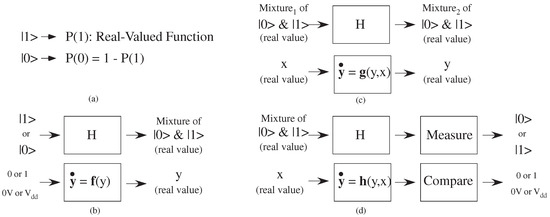 Translation between Qubit-based quantum computation and analog computation. Both Physical computing approaches are computations over real values. (a) Although one starts with individual states (<0 or <1), typically one has simultaneous probability of <0 and a probability of <1 (superposition). (b) Discrete valued inputs, represented as two quantum or voltage states, through a transformation (c) Real-valued inputs, represented as a mixture of two quantum states or an analog voltage, moves through a transformation to another mixture of two quantum states or an analog voltage. (d) Real-valued inputs, represented as a mixture of two quantum states or an analog voltage, moves through a transformation and then moves to a discrete value through measurement. For quantum computation, this measure operation typically is the basic nonlinear operation element. This measurement operation for analog computation is a comparison operation of some form.