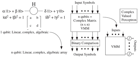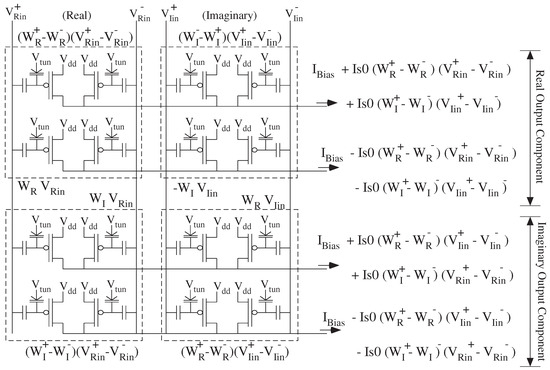 resulting in four real-valued multiplications (Figure 10), but otherwise resulting in a typical VMM operation. The time-evolution of a qubit array of qubits is typically not considered as the solution is thought to happen instantaneously, often as one sees an analog computation occurs instantaneously. Even so, one can model the linear complex wavefunction dynamics (e.g., Schrodinger’s equation) of these devices converging to their steady-state solution through element time-constants () similarly to modeling an analog VMM converging to its linear dynamics through element time-constants (). A time domain model could include either feedforward or feedback where the steady-state solution would still simplify to a single complex VMM operation. Using sinusoids of a single frequency with different amplitude and phase (a phasor) provides a second method of implementing the complex operations. The phasor approach computes Hilbert spaces by analog circuits [50,52], theoretically that can be extended to transformations with classical cochlear modeling (e.g., [53,54]), with no difference in overall computational capability.