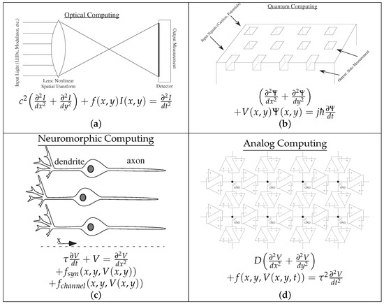 Second-Order Partial Differential Equations (PDE) provide a translatable framework between these different R-valued computational mediums (Figure 12) computing over R-valued amplitude, space, and time (Table 1). Optical computing utilizes waves, described through a second-order time and space PDE formulation of Maxwell’s equations, computing through continuous time, amplitude, and 1- to 3-dimensional space utilizing a number of spatial filters, lenses, and a variety of tunable light modulators & mirrors can modify an input optical signal. Quantum computing uses complex probability wavefunctions () governed through PDEs (Schrodinger’s equation) computing through continuous time, amplitude, and 1- to 3-dimensional space. Typical implementations compute multiple quantum wells, potential energy barriers, and connected states governed by these PDEs. Neuromorphic computing (e.g., [10,62]), including Neural Networks (e.g., [30,31]), uses physical computing devices, typically of an analog nature in Si or hybrid system, modeling part of a neurobiological computations (e.g., neurons) using continuous amplitude, time, with at least 1-dimensional space PDEs in neuron computation (e.g., dendritic systems) [63]. Neurons are spatio-temporal computing elements with hundreds if not thousands of inputs, modeling voltages governed by diffusing and wave-propagating PDEs (Figure 12). Analog neuron implementations have demonstrated hundreds of inputs (e.g., [64]) as well as wave-propagating PDEs (e.g., [63]). The dendritic PDEs have a significant linear operating range within the overall biological structure.