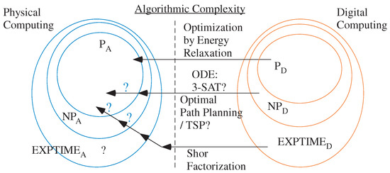 At another level, computing over R versus Z likely has additional benefits including addressing the relationship between NP and EXPTIME to P and NP (Figure 13). Some examples in P appear to be beyond P. such as Shor’s quantum factorization algorithm [35]. Multiple coupled ODEs systems have been proposed to solve NP problems, such at the 3-SAT problem [33,34,70,71,72], that could be implemented on a configurable continuous-time platform [19], although to date it has not been verified through physical computing approaches. The potential overlap of EXPTIME (e.g., Shor Factorization) with P and NP gives motivation for deeper explorations. Throughout this process, synchronous digital simulation results of physical computation must always be approached cautiously, as digital computation is more limited than the resulting physical substrate (Figure 4).
