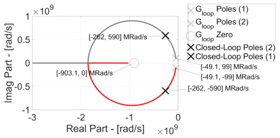 Figure 3 shows the Gauss plane root locus of the FSF biquad cell, where the loop-gain poles and zero with closed-loop poles are plotted, and as expected, the locus is attracted by the zero (whose frequency is 2·π·gm1/C1≈900 MRad/s) and moved away from the poles ((−49.1 ± j·99) MRad/s which have an equivalent quality factor (QLoop) equal to 1.12).