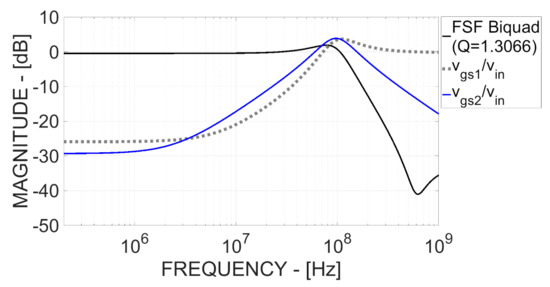 Inter-modulation (IM) distortions in FSF biquads are substantially set by M1 and M2. M3 operates as a current source and it does not introduce a relevant distortion contribution in its first approximation. The M1 IM distortion power ratio of the two components at ω1 ± ω2 to the fundamental, called IM3,M1 (IM3,M2), is measured at the output of the FSF biquad and it is in first approximation depending on two key design parameters: the amount of M1 (M2) gate-source voltage swing (vgs1 and vgs2) vs. the overdrive voltage and the loop gain [15,16]. Figure 4 shows vgs1/vin and vgs2/vin frequency responses extracted by the following transfer functions, referring to the scheme in Figure 1: