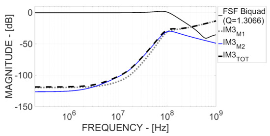 Figure 4 and Figure 5 curves were obtained by simulating a MATLAB small-signal model of the biquad B, whose main design parameters are listed in Table 2. IM3TOT is −118 dB at low frequency, and it rises to −28 dB at 100 MHz; therefore, the resulting simulated input IP3 for the FSF biquad will range from 29 dBm at low frequency down to −2 dBm at 100 MHz, which is in line with the expected measurement results for single cell linearity.
