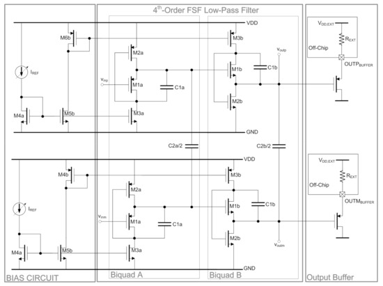 - Fary, F.; De Matteis, M.; Vergine, T.; Baschirotto, A. A 28 nm-CMOS 100 MHz 1 mW 12 dBm-IIP3 4th-Order Flipped-Source-Follower Analog Filter. In Proceedings of the ESSCIRC 2018-IEEE 44th European Solid State Circuits Conference, Dresden, Germany, 3–6 September 2018; pp. 298–301. [Google Scholar]