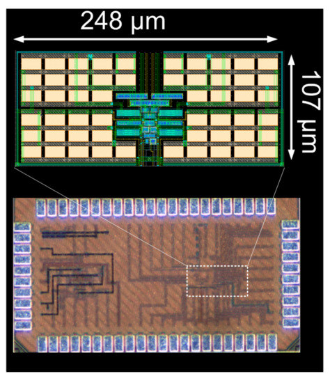 The transistor-level pseudo-differential scheme of the proposed filter is shown in Figure 6. The device has been integrated in 28 nm CMOS technology and fully characterized in terms of operating point, frequency, and time domain performances. The chip and layout photo are shown in Figure 7. The whole FSF filter occupies 0.026 mm2.