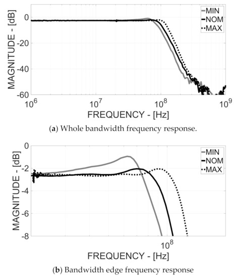 Figure 8 shows whole pass-band (and pass-band right edge) filter frequency responses in nominal conditions (nominal IREF of 10 µA) and with maximum and minimum currents (where IREF is 12 µA and 8 µA, respectively). The filter DC gain is −2.5 dB. This drop is mainly due to the output buffer that has been biased to maximize bandwidth at the cost of a small gain reduction.