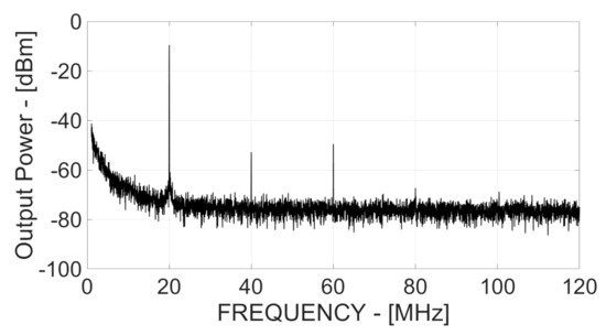 The filter linearity has been characterized by single and double tone tests. The output spectrum of a 0.33 V0-PEAK output signal at 20 MHz input frequency is shown in Figure 9. The third-order harmonic distortion is dominant, and it is equal to −49.5 dB, resulting in a Total-Harmonic-Distortion (THD) of −40 dBc.