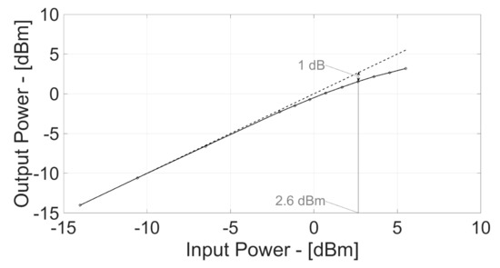 The 1 dB compression point (1dB-CP) of 2.6 dBm (0.426 V0-PEAK output voltage) has been measured, and the corresponding input/output characteristics are shown in Figure 10.