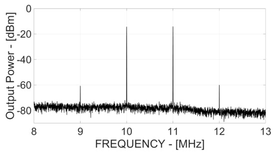 Figure 11 and Figure 12 show the two-tone output spectra for 10 and 11 MHz and 50 and 55 MHz input tones frequency.