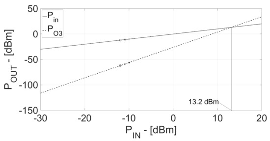 The third-order intermodulation product is −46 dB and −40 dB, respectively (with a two output iso-power tones of −14 dBm and −20 dBm).