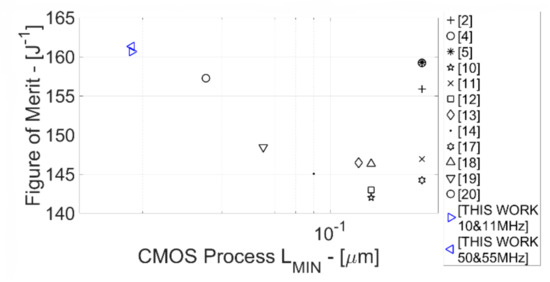 The filter achieves the significant 160 and 161 dBJ−1 FoM (for 10 and 11 MHz and 50 and 55 MHz, respectively, as shown in Figure 15), outperforming analog filter implementations in scaled nodes (<130 nm), enabling 28 nm CMOS analog filters for future telecommunications wireless transceivers.