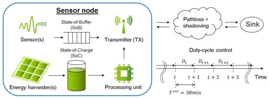 A supercapacitor is considered an optimal solution as an energy storage in energy-harvesting applications because of the well-balanced trade-offs among physical lifetime, energy density, maximum charge cycles, and self-discharging rate [27]. Let and denote the maximum and minimum (i.e., failing-threshold) energy levels. The state-of-charge (SoC) of the residual energy is represented as: