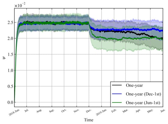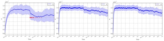 - The variances of the mean values taken over all the simulations at the same time points are confirmed to be not different, i.e., the homogeneity of variance is tested and confirmed by means of Levene’s test [36], more precisely Brown–Forsythe [37] test, with the confidence interval of (note that we cannot say “the same” mathematically).