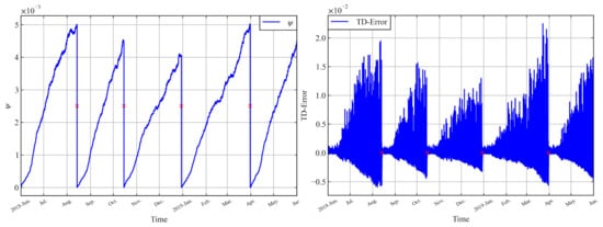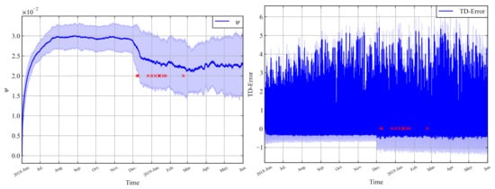 Divergences of (left) and TD-errors (right) over one year with the state-of-the-art LAC method (red crosses indicate the power failure points).