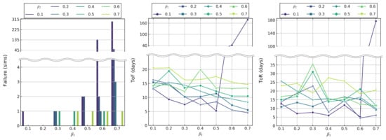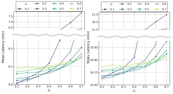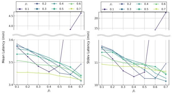 The analysis on the latency in the two different workload periods was also conducted, as illustrated in Figure 9 and Figure 10. As can be seen, the results show the opposite trends. For the first six months, the latency has a tendency to decline as increases, ranging from to 3.6 and from 10 to 12 for the mean and standard deviation, respectively, except for with . By contrast, the rising trends are observed during the period of doubled workload, where the mean and standard deviation of latency fall between and 6.2 and between and 11 , respectively. Again, the exceptions occur with with . These phenomena are explained by the effectiveness of high adaptability to each situation; higher adaptability by smaller decay rates is more suitable when the state such as SoB varies greatly (e.g., during the last six month), and less when the state is relatively constant (e.g., during the first six month).