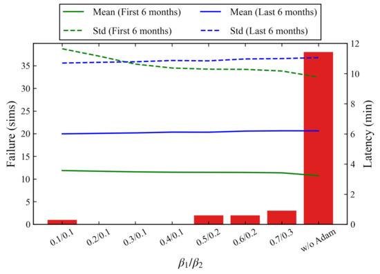 With respect to the latency and power failure, Figure 12 depicts these metrics for the chosen decay rate combinations in comparison to the LAC algorithm without Adam. The EHD1 dataset was used to obtain the results consistent with the real-world situations. The differences in the mean values of latency are not outstanding across all cases, but the mean standard deviation for the first six months tends to decrease as the decay rates become larger, especially until reaches , while that for the last six months shows the opposite trend. Nonetheless, too large decay rates as well as fixed learning rate are more likely to bring about power failures. With smaller decay rates, the controller reacts more quickly to environmental stochasticity, leading to larger variations in latency, i.e., duty-cycle in case of less drastic changes as in the first six months, and yet with no or a couple of power failures, compared to 38 times in case of using fixed learning rate.