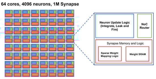 - Akopyan, F.; Sawada, J.; Cassidy, A.; Alvarez-Icaza, R.; Arthur, J.; Merolla, P.; Imam, N.; Nakamura, Y.; Datta, P.; Nam, G.; et al. TrueNorth: Design and Tool Flow of a 65 mW 1 Million Neuron Programmable Neurosynaptic Chip. IEEE Trans. Comput. Aided Des. Integr. Circuits Syst. 2015, 34, 1537–1557. [Google Scholar] [CrossRef]