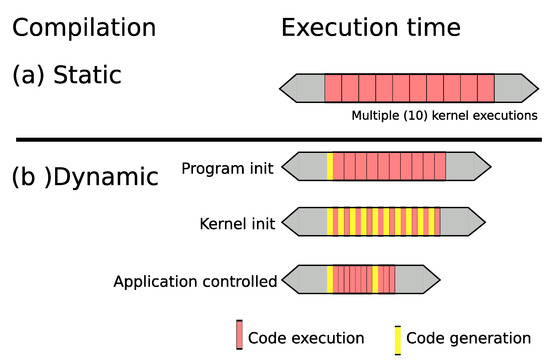 There are different code generation times to generate a code for an application. In a standard development flow, the code is generated at static compilation times. Data values are resolved at run time and with only one step of compilation before the execution, some optimizations cannot be applied.