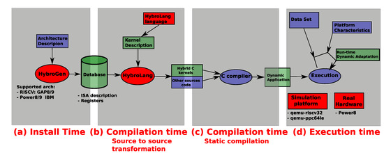 HybroGen is composed of four steps, shown in Figure 2 which correspond to different times: install time, source-to-source compilation time, source-to-binary compilation time and execution time. At install time (Figure 2a), the description of the instruction set architecture (ISA) is stored, maps to the compilation source to source and is specific to the proposed HybroGen compilation flow. The input is a kernel described with HybroLang language as described previously. Our compiler HybroGen implements different passes of compilation, such as a classic compiler, but at the output, it produces a code in an existing programming language; for this paper, it produces C code. HybroLang requests the database to construct a code generator, which writes the correct encoding at run time. After using HybroLang , we use a compiler for the second compilation time (Figure 2c) such as gcc or clang. In this paper, we used gcc. Finally, depending on the scenario choice, at execution time (Figure 2d), the code of the compilette is executed, which generates the instructions that are executed at the backend.