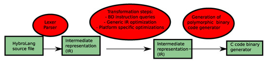HybroLang compilation chain. Contains classical compilation steps—lexer and parser, generic and specific IR optimizations— and also specific ones, using an SQL database to store instruction specifications and C code generation, which act as the polymorphic binary code generator at run time.