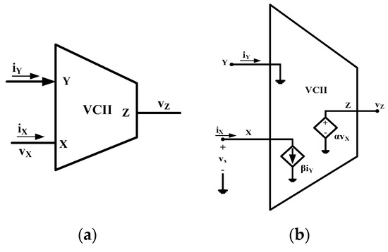 The symbolic representation and internal structure of VCII are shown in Figure 1. In this block, Y is a low-impedance (ideally zero) current input terminal. The current entering into Y node is transferred to X terminal which is a high-impedance (ideally infinity) current output port. The voltage produced at X terminal is transferred to Z terminal which is a low-impedance (ideally zero) voltage output terminal. The relationship between port currents and voltages are given by: and . In the ideal case we have α = 1 and β = ± 1. If β = 1 we are considering a VCII+, whereas if β = −1 we have a VCII−.