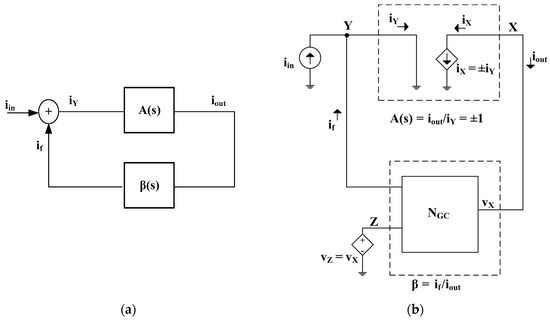 The characteristic equation (CE) of the whole system can be calculated replacing, in the circuit of Figure 2, the equivalent model of a VCII of Figure 1b and considering a fictitious input at the node (of course, no input signal will be present in an actual oscillator circuit), as shown in Figure 3a at the building block level and Figure 3b in more detail.